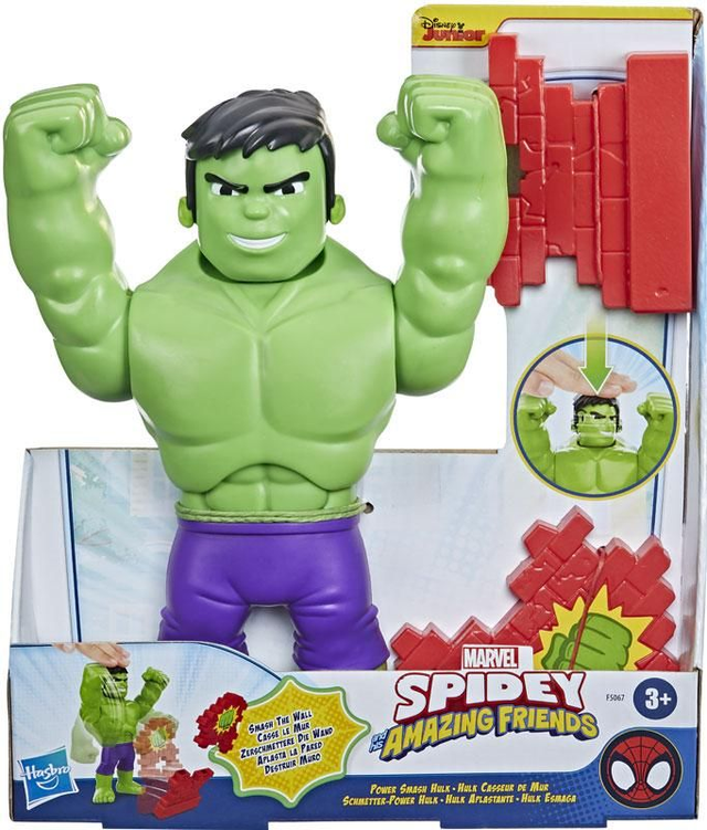 Feel the power with the Spidey and His Amazing Friends Power Smash Hulk action figure! This 25-cm-tall action figure for children is ready for Super Hero fun. When kids press down on Hulk’s head, his head turns to switch his facial expression from happy to powered-up, so pre-schoolers can imagine him charging into action! Push down on the Hulk figure’s head to raise and lower his arms so that he can knock down the included two-piece wall accessory. Inspired by the pre-school Marvel programme, this Hulk toy makes a fun gift for 3-year-olds and up who love the adventures of Spidey, Miles Morales: Spider-Man, Ghost-Spider and all their Amazing Friends. © MARVEL. All trademarks and registered trademarks are the property of their respective owners. Hasbro and all related terms are trademarks of Hasbro.